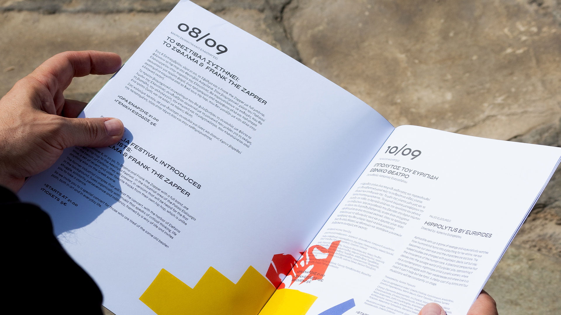 More specifically, we used bold, modern typefaces to contrast and complement the classical motifs, symbolizing the festival’s bridge between past and present. The layouts are structured yet fluid, reflecting the dynamic interplay of tradition and innovation. A carefully selected color scheme merges the earthy tones of Elefsina’s ancient landscapes with vibrant, contemporary hues, representing the city’s transformation and the festival’s diverse artistic expressions. Our visual compositions include layered images and abstract forms that evoke the archaeological richness of Elefsina and its evolving identity. This collage technique aligns with the festival’s use of ancient texts and modern narratives, creating a cohesive visual metaphor for rebirth and redefinition.