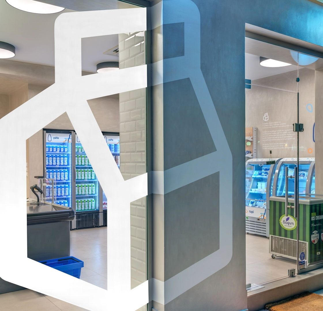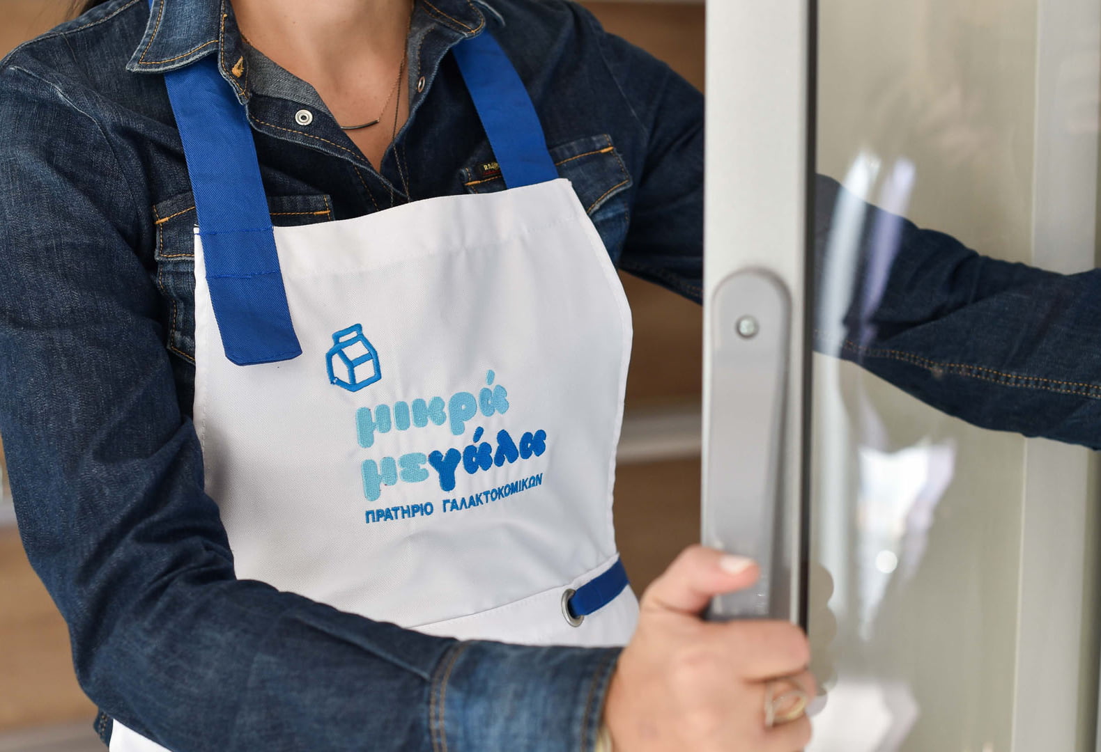 Faced with the modern-day reality of super market chains and incumbent dairy industries, these modern creameries were created to help every family cover its basic nutritional needs on a daily basis. This mission places these stores within a “David & Goliath” model on the contemporary market. The name “Mikra Megala”, meaning “little large” stores, is based on this duality, as well as on a Greek pun, where the word “Megala” (large) also means “with milk”.