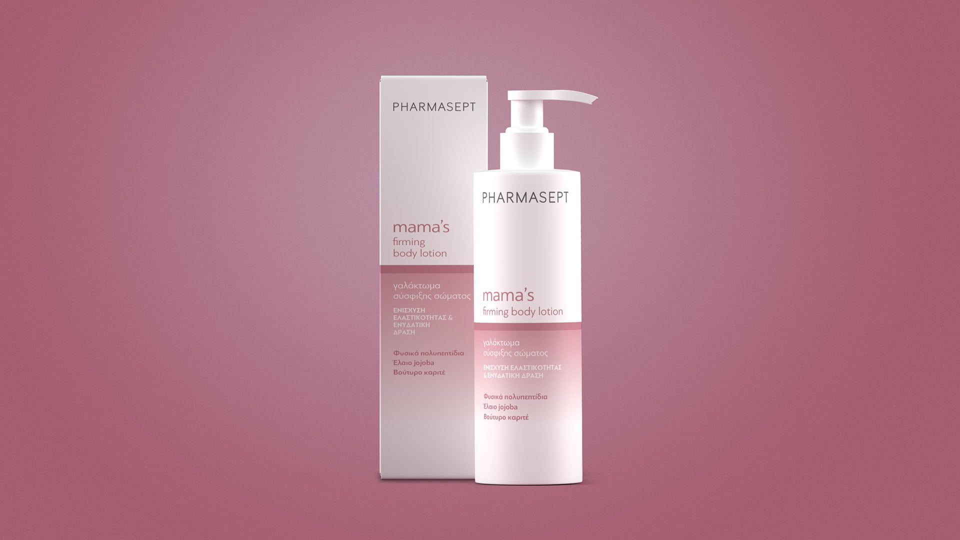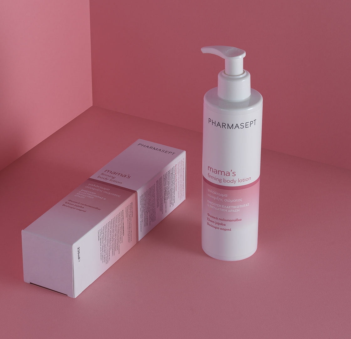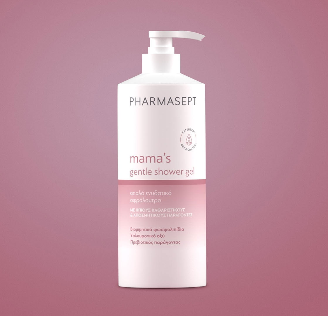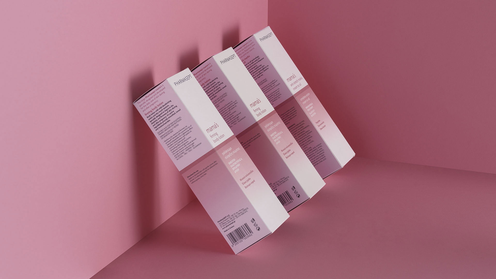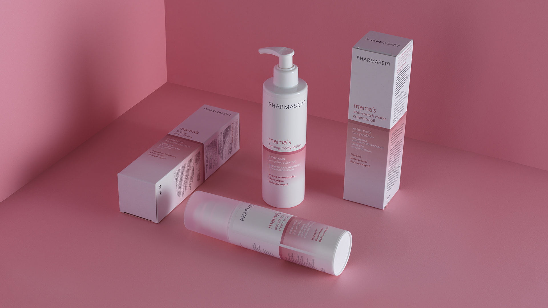 Thus, the design of the new Mama’s range is in keeping with the Pharmasept house style, which divides the packaging in two parts: the part belonging to the Pharmasept logo and the range name, and the part containing the claims and the main design element. In the Mama’s range, the gradient colour treatment for the lower half was chosen in keeping with the brand’s other specialized skincare and hygiene ranges. The dusty pink colour coding connotes warmth, affection and tenderness, emotions that are attached to motherhood and self-care.