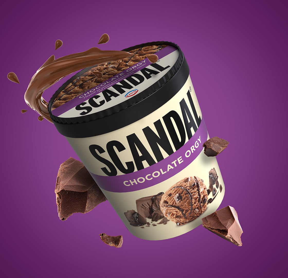 Scandal’s image renewal was centered around few but dynamic moves. Bold typography was one of them. The Scandal logo took on cinematic dimensions over shots of rich scoops. And in order to maximise the sense of indulgence, we used the tub lids to reveal the exciting textures of the ice cream.